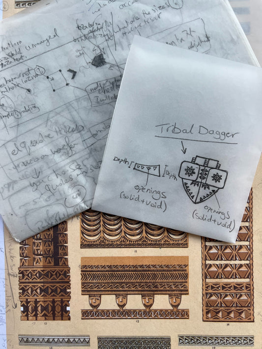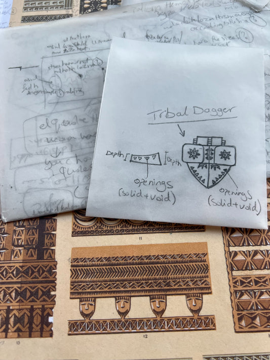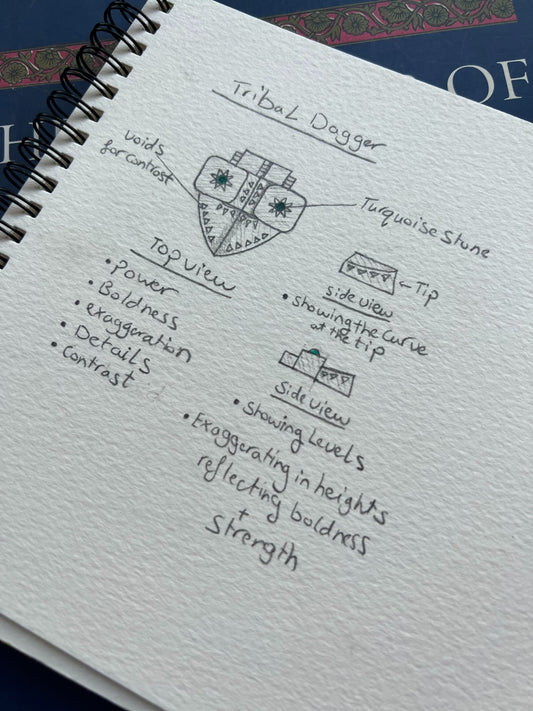One of the main targets in the design is to show the beauty of the geometrical pattern carvings created by the early tribes. The use of a certain pattern in a repetitive manner to create and form a final unique piece of jewellery. As well as using a dagger weapon in the design adding value, strength, and power. In addition involving the solid and void technique that anticipated in making each designed piece more distinctive, evident, and eye-catchy.